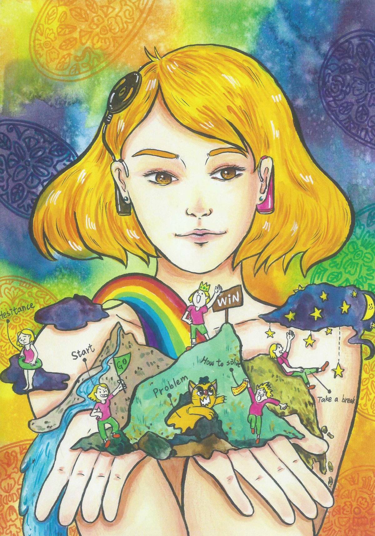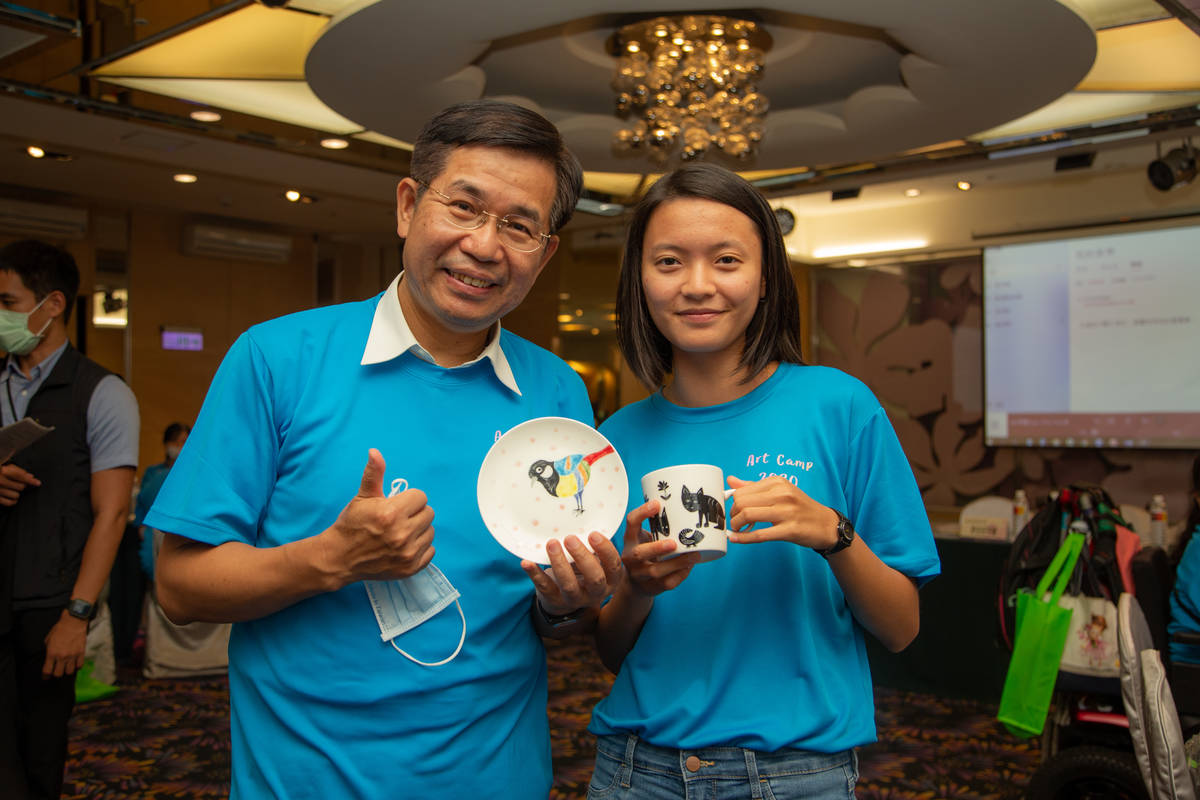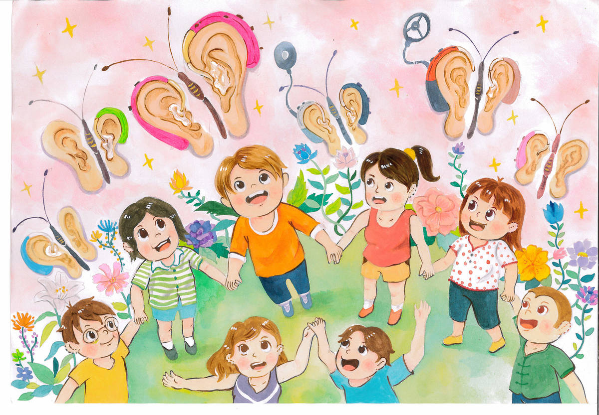 連續兩屆參加本部大專校院身心障礙學生藝術夏令營的康宇瑄同學,目前就讀國立臺灣藝術大學視覺傳達設計系,因先天性遺傳的前庭導水管擴大症導致聽覺障礙,6歲時開人工電子耳,配戴人工電子耳及助聽器。宇瑄從小就展現創作天賦,除獲獎無數外,更貢獻自己的專長為聽障團體書籍繪製插畫;去年擔任指導藝術夏令營團隊的林淑華教,授讚許宇瑄的作品題材極具開創性,處處可見其細膩深刻的用心,高度展現她運筆技巧和線條流線的能力,作品裡的貓、狗和小鳥紋飾繁複繽紛,表現出被注目、被傾聽的溝通渴望。