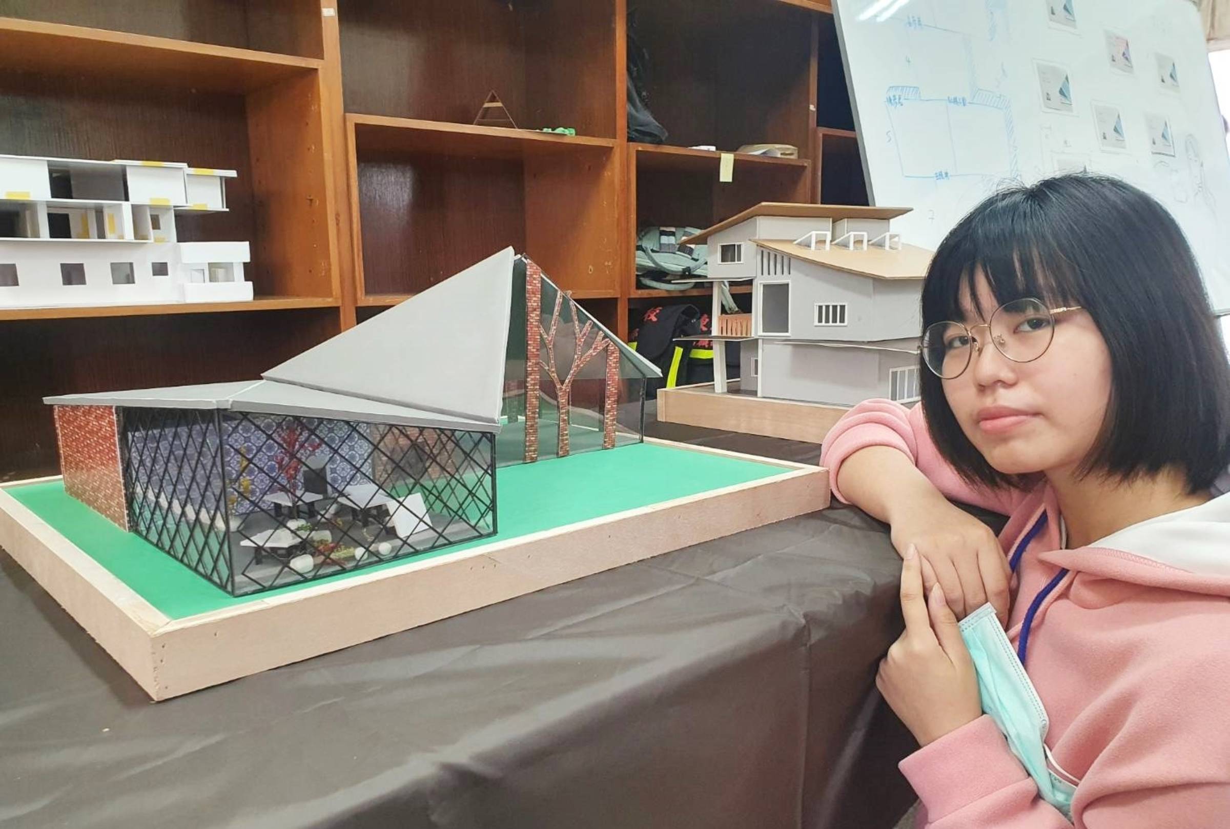 學生陽慧瑾的設計作品「花點時間」,打造結合花藝展售與教學的花藝體驗館,以舊火車站後方的廢棄建築為基地,建築外部採網狀玻璃牆體,讓經過的遊客對內部配置、活動與銷售品項一目了然,牆柱則設計成樹的造型,當陽光照射就會在室內產生樹的倒影,和週遭的草地、樹叢等自然環境融為一體。