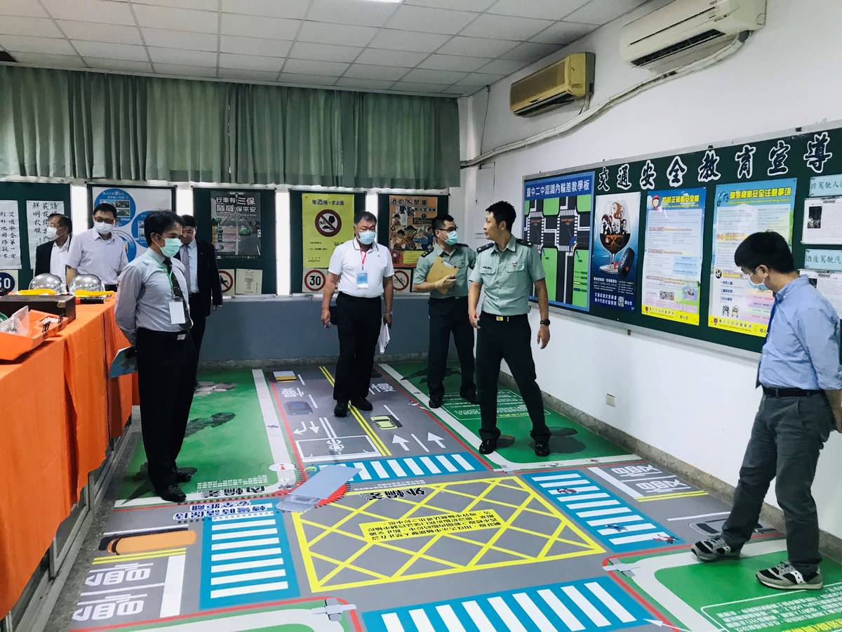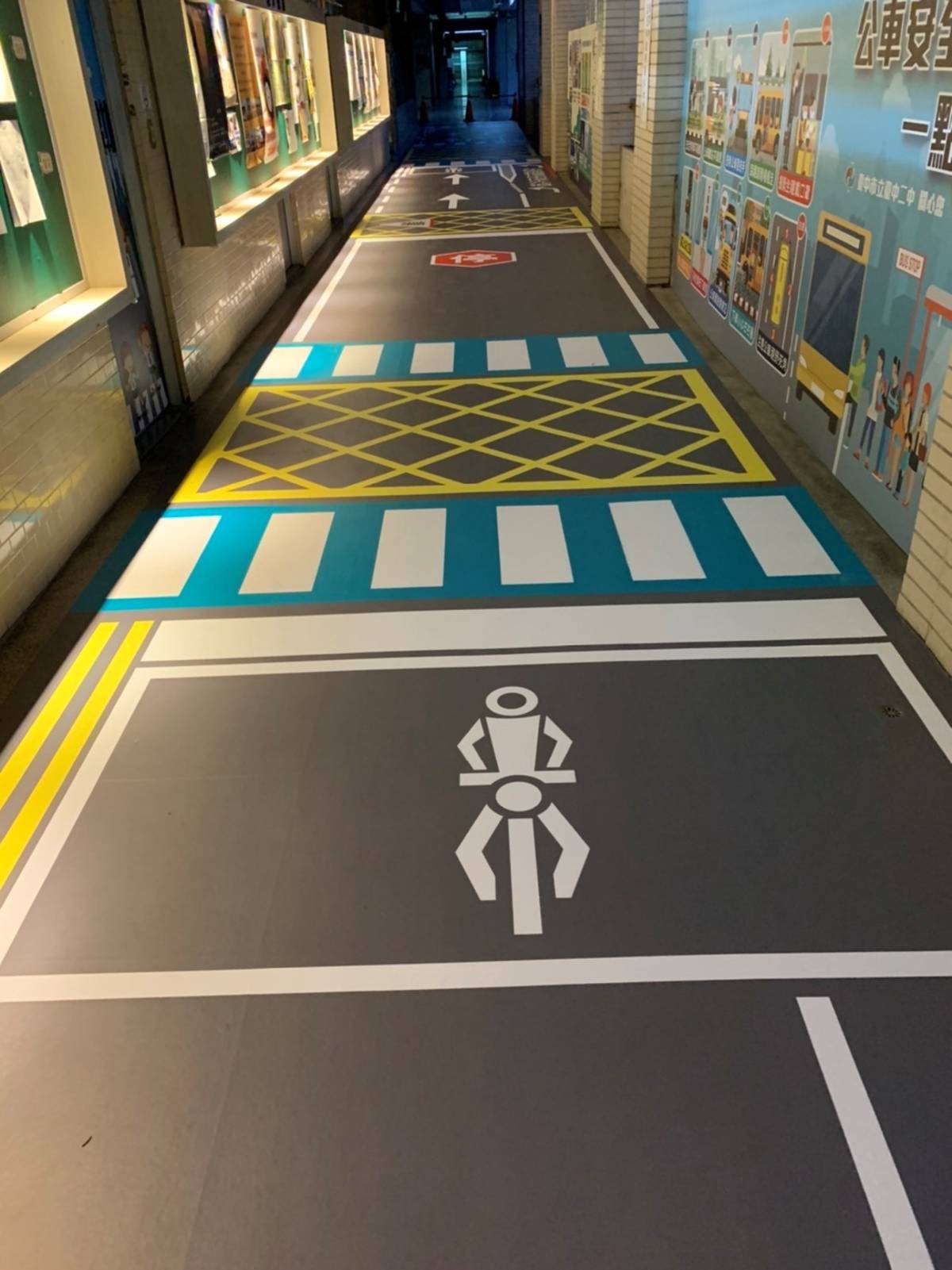 另外,校內設置交通安全教室,模擬實際道路製作地貼,以大面積圖示說明大型車的內輪差,教導學生用路時保持安全距離;更利用走廊鋪設地貼,營造道路實境,圖示包括各式道路標誌標線及號誌、行人穿越道、機車停等區,沿途並設置3大交通安全教育(捷運、公車及自行車)宣導文宣,幫助學生建立用路觀念。