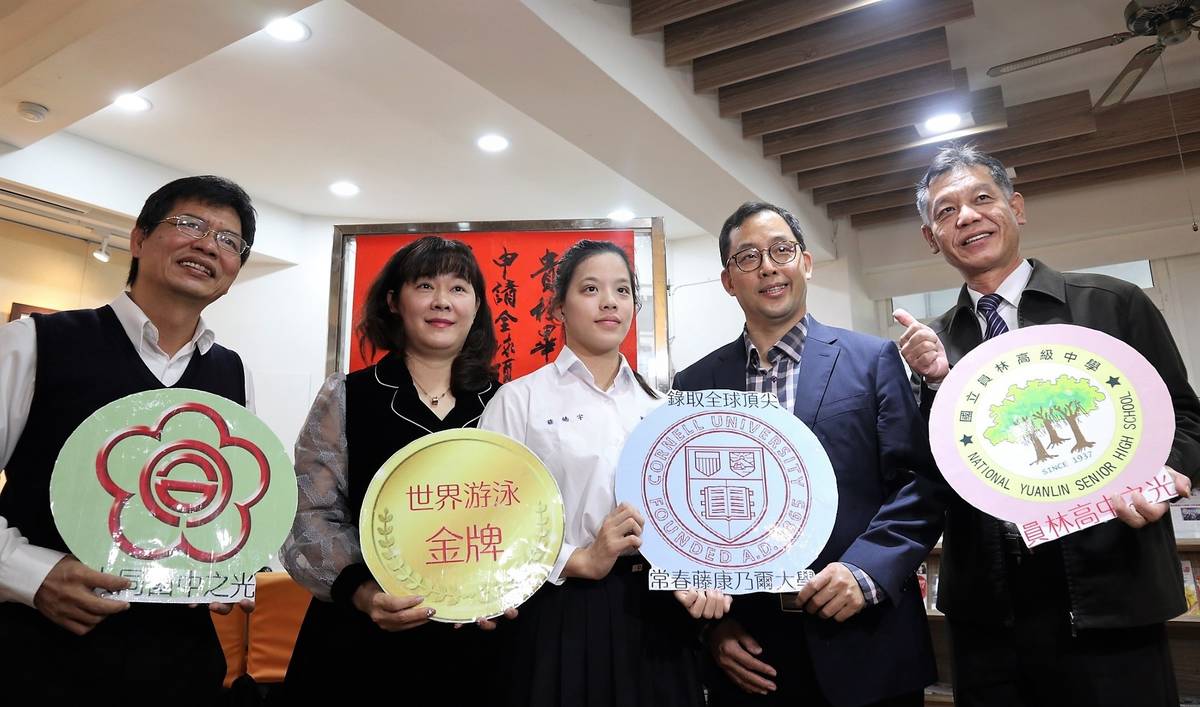 彰化縣員林高中三年級學生蔡皓宇去年在世界中學生游泳錦標賽50公尺蛙式打破紀錄,為台灣抱回金牌,今年她以優異成績申請美國康乃爾大學動物醫學系,成為員林高中進入美國長春藤名校的第一人,員林高中校長游源忠今天特地到蔡皓宇的母校大同國中貼紅榜,希望激勵學弟妹。游源忠表示,蔡皓宇不只有游泳比賽金牌,甚至學科成績也相當優異,這次同時獲得普林斯頓大學、達特茅斯學院和紐約大學名校青睞,最後選擇全美獸醫學院排行第一的康乃爾大學,希望未來能跟她的父親一樣從醫。