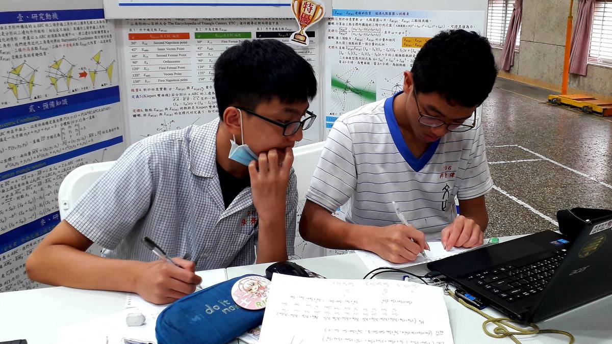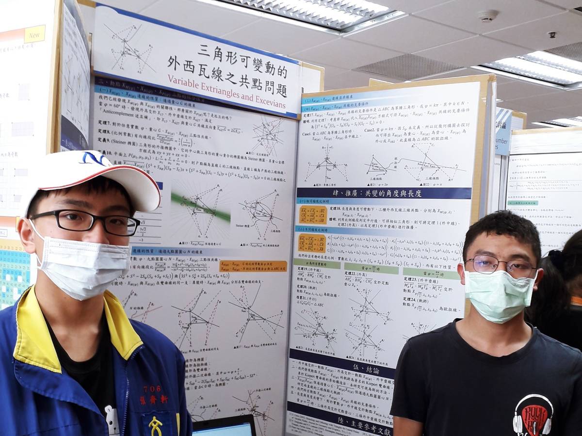 文山國中許崇煒及張齊軒同學研究作品「三角形可變動的外西瓦線之共同問題」獲頒國際科展數學科四等獎,兩位同學提到,去年參加全國科展之後,設定了共變角度與長度的條件去提昇難度,常利用放學和假日進行研究,能參加國際科展,看見許多更優秀的作品,很感謝評審教授與指導老師的指導。指導老師蕭偉智表示,學生能在9年級升學階段仍懷抱熱情的參與國際科展,展現出對數學的高度喜愛,十分難得。