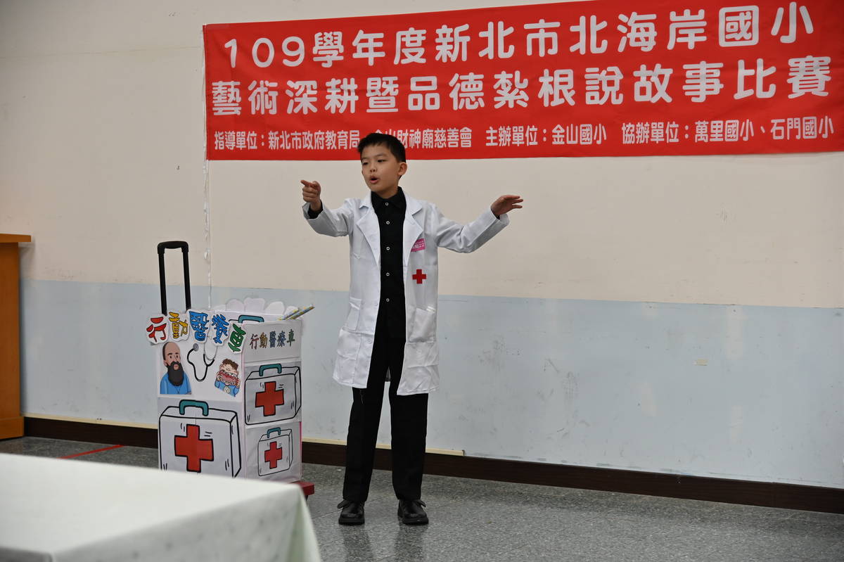 新北市北海岸國小說故事比賽今(13)天在金山國小熱鬧登場,是北海岸地區首次以「品德教育」為主題的大型說故事比賽,讓偏鄉的學生除了能悠游於閱讀之中,更能將孝道、行善、天倫等題材透過說故事的方式表現出來,涵養學生的良好品德。金山財神廟慈善會黎清美理事長表示,故事比起長篇大論,更能深植人心,達到潛移默化的效果,未來會持續來推廣贊助在地的慈善活動,讓善念能深植人心。