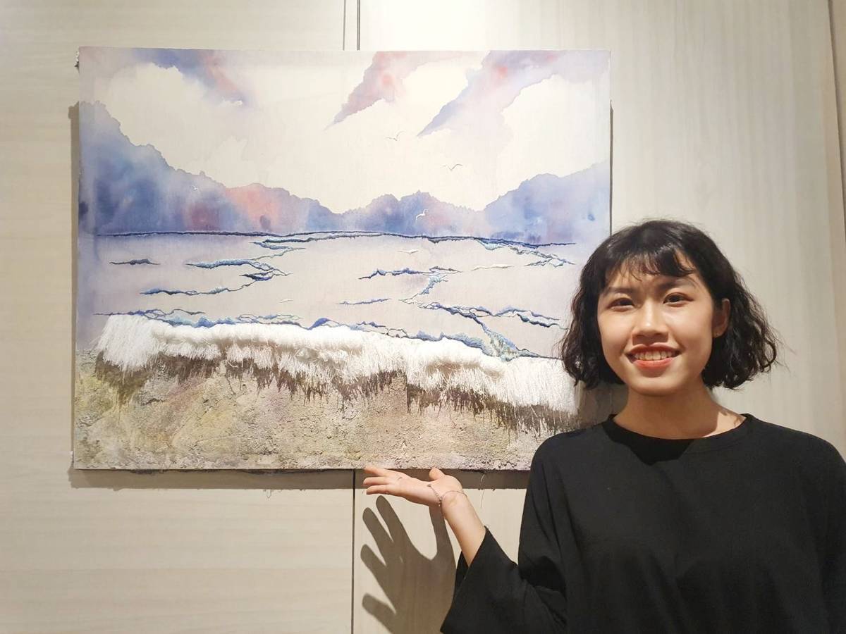 展場中40件作品多呈現臺東景色與自我心境,如葉明珏的複合媒材創作《水人母》,用藍色棉線編織出海的波動,岸上的浪花則是剪成絲的白色鞋帶,再以水彩暈染手法呈現空中的彩霞,葉明珏說,水、人、母3字湊起來就成「海」,她也將不同媒材組成能療癒人心的海景,向大家分享自己觀海的心境。