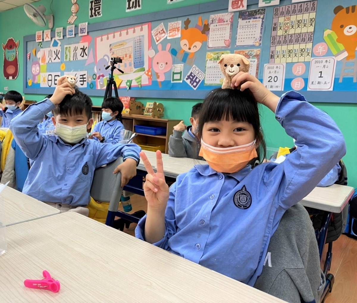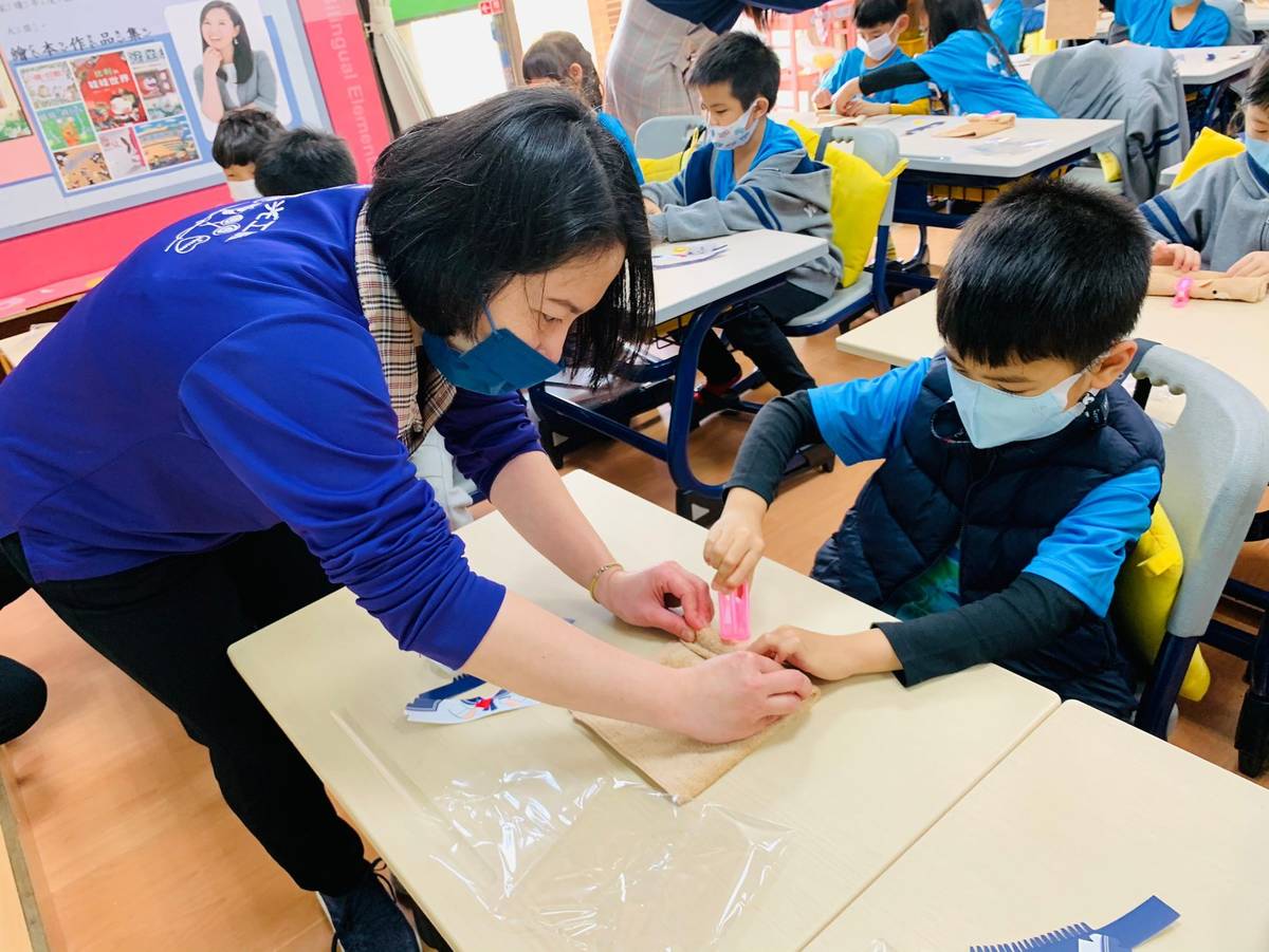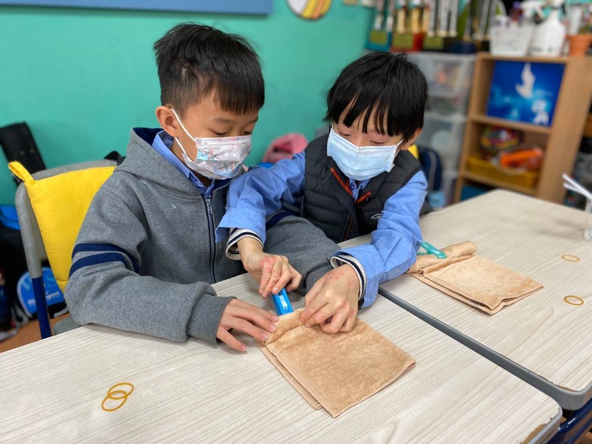 課程最後,學生們動手製作小熊造型的立體毛巾,作為本次專題課的紀念品。班級導師Wendy分享,一年級學生的手腳較不靈活,製作上其實並不容易,但是因為小熊非常可愛,成功征服童心,學生們做得不亦樂乎,也很驚訝平面布料可以變成立體玩偶,發現毛巾的更多可能性。