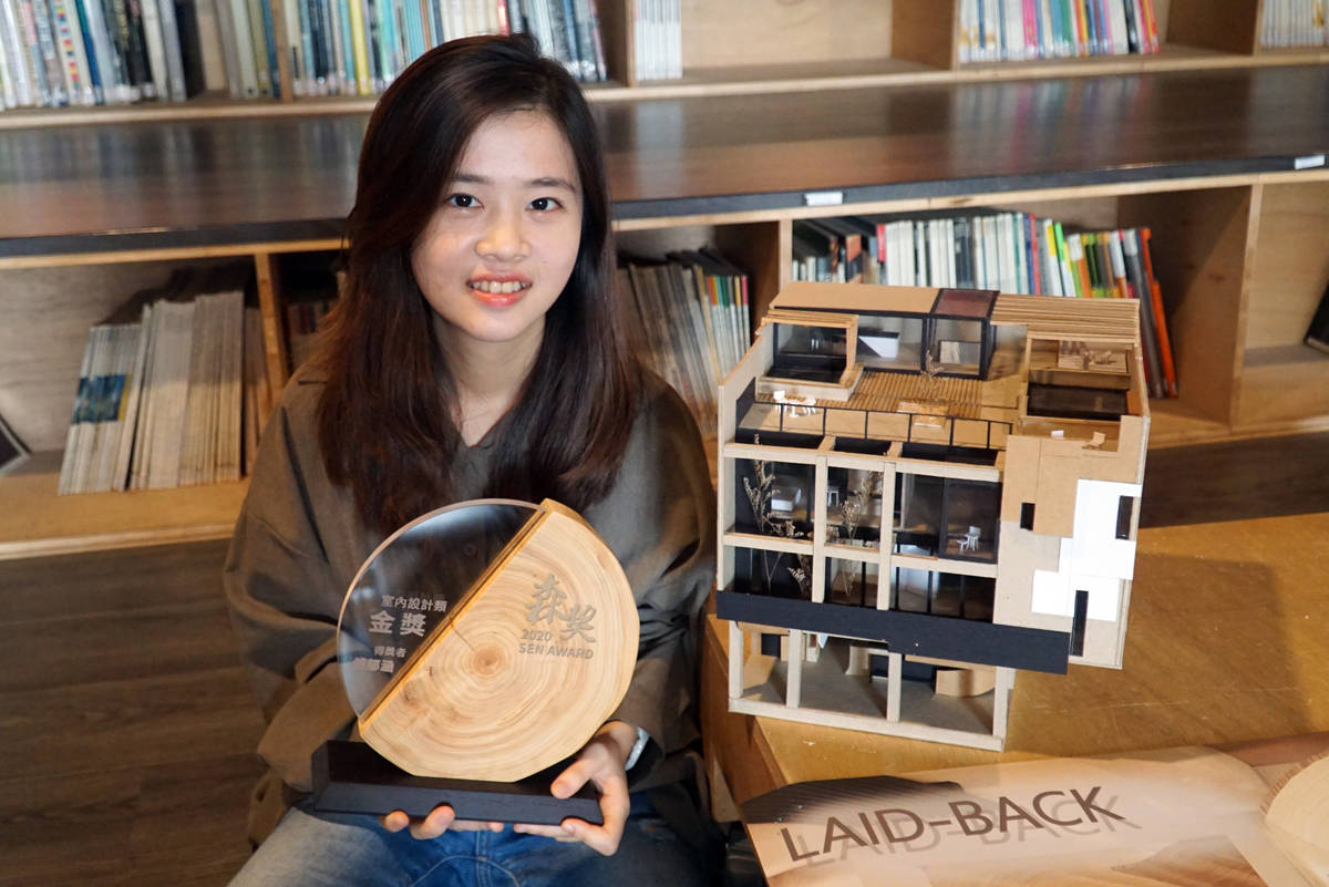 同時獲得空間設計類金獎與傢俱設計類佳作的空設系二年級學生傅郁涵表示,「LAID-BACK」以員林火車站旁邊的街屋發想,因為現在騎樓設置攤販,導致行人行走不易,用餐民眾也會受到影響,因此她以住商混合的設計,將一樓規劃為麵店、二到四樓為住宅,並從麵條的形狀有線性、曲面等元素設計空間。傅郁涵的家具設計「JUST GO」則結合書櫃和兒童遊戲間,讓小朋友可以發展閱讀、想像力和活動力。
